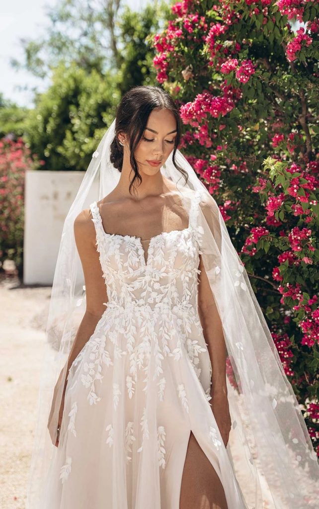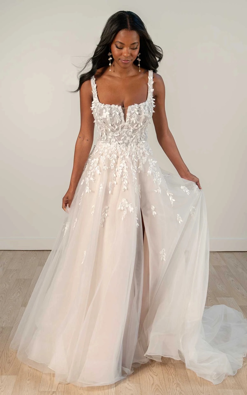 Style 7965 embodies romantic bridal elegance with a soft A-line silhouette and allover lace bridal look. The flattering square neckline features a subtle peekaboo plunge lined in sheer tulle, adding a touch of glamour to this classic wedding dress. Delicate shoulder straps support a sheer bodice, where leafy tendrils of 3D florals cascade down, creating a mesmerizing effect as they blend into lace appliques that gracefully scatter across the sweeping A-line skirt. A scooped back detail and high leg slit add a flirty touch to this romantic lace wedding gown, forming a seamless blend of timeless charm and modern sophistication. This wedding dress is also available in plus sizes.