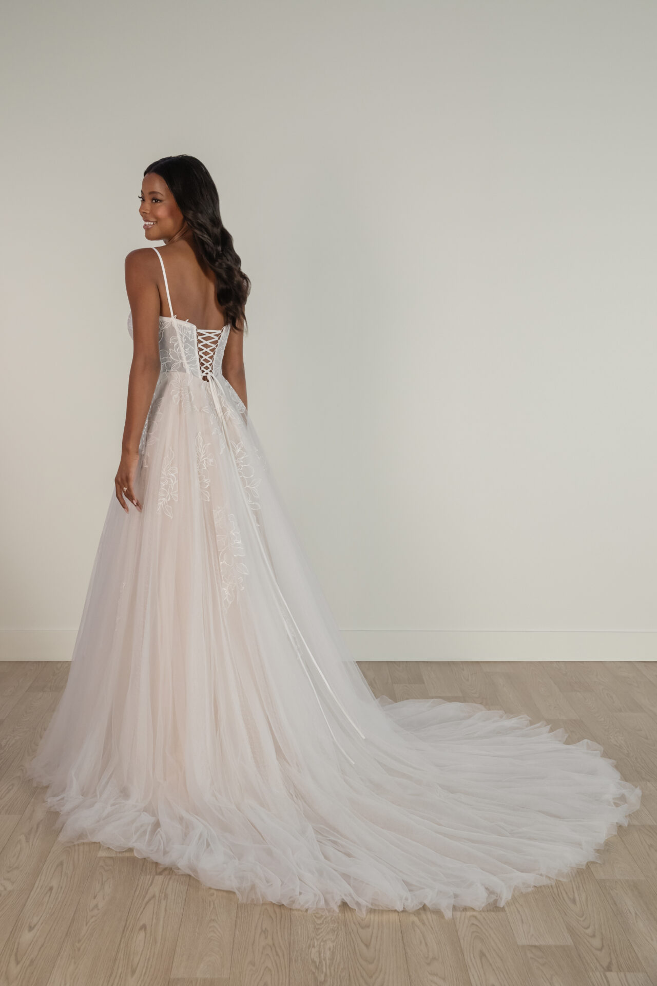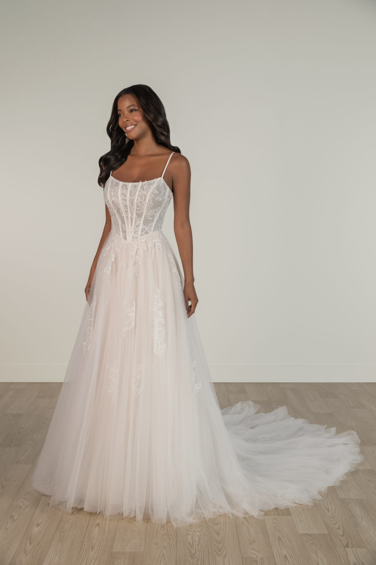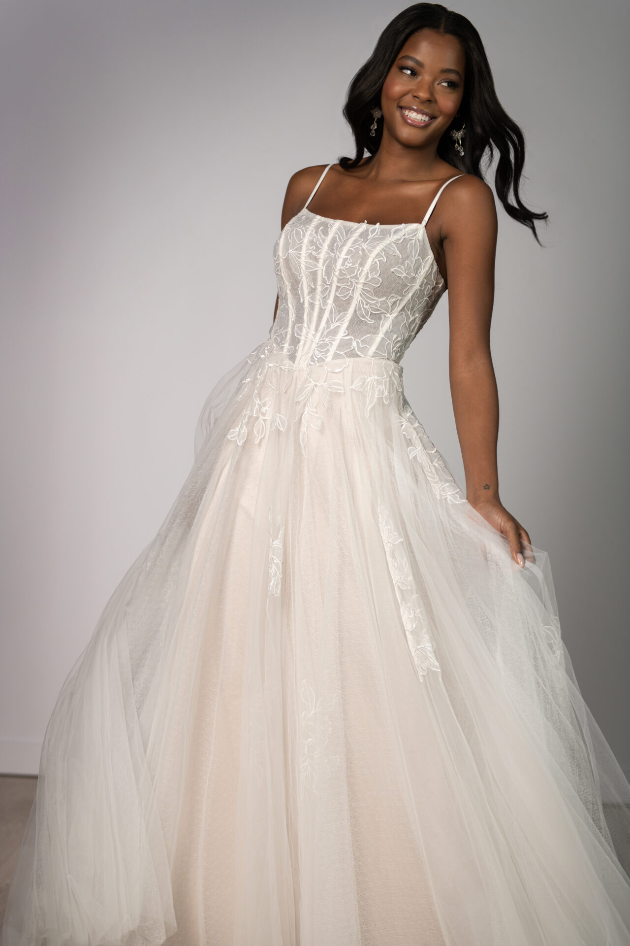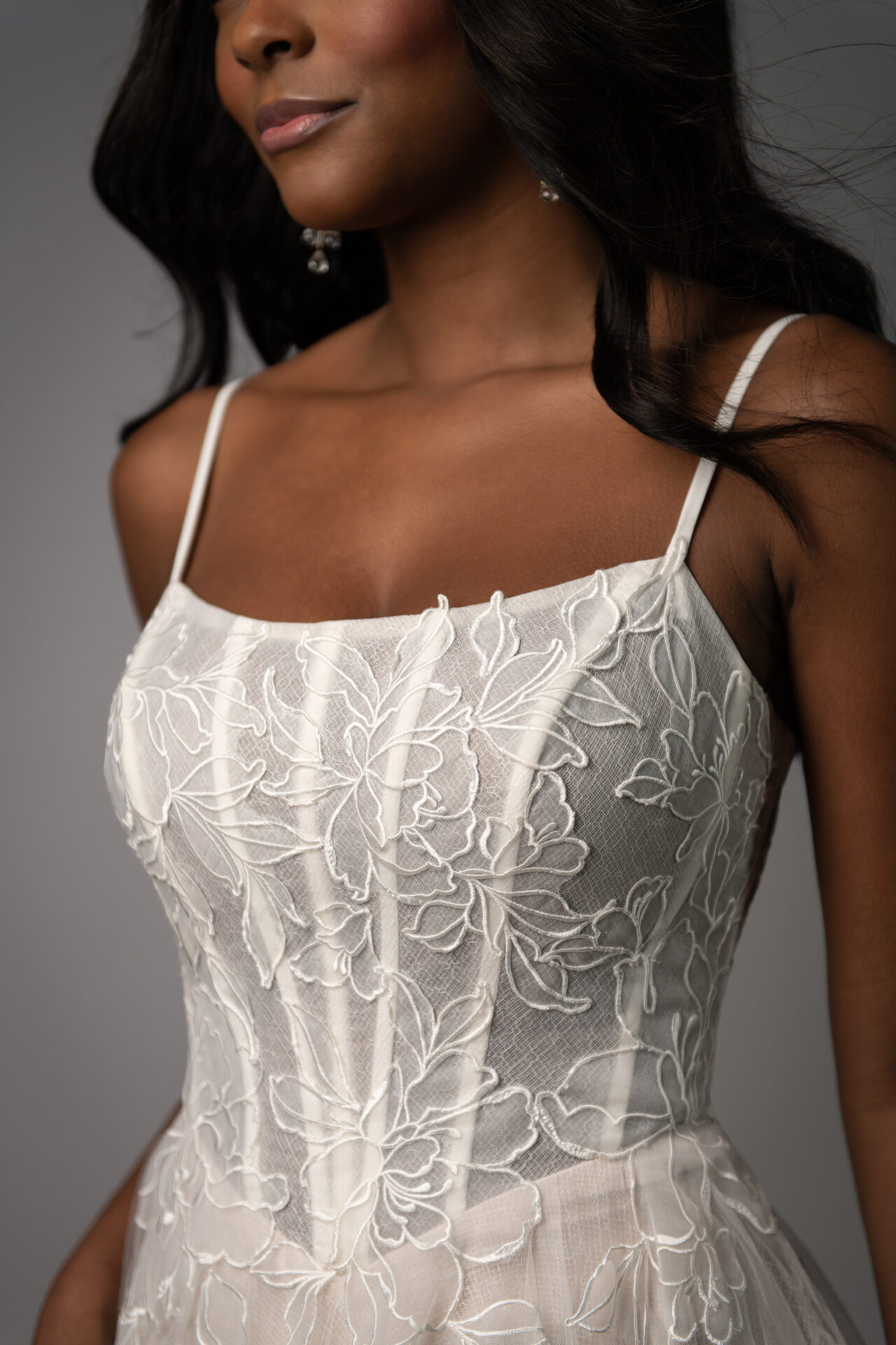 Both glamorous and romantic, Style SY8114 is a dreamy matte lace ballgown designed for the modern princess bride. Delicate spaghetti straps frame a sheer bodice with exposed boning, beautifully adorned with oversized organza lace appliqués. From the classic basque waist, scattered floral lace drifts down the airy tulle skirt, enhancing the enchanting ballgown silhouette. Blending timeless elegance with modern charm, this breathtaking wedding dress is the ideal statement for the bride who desires a fairytale-worth look with a contemporary edge.