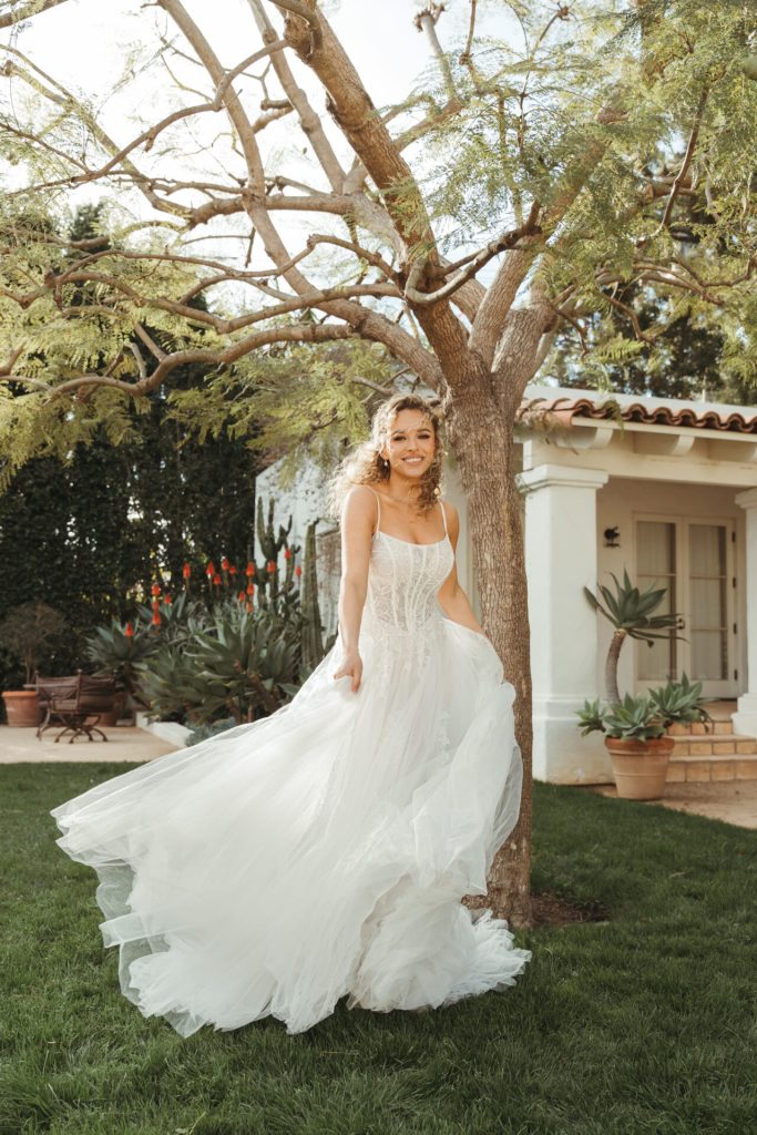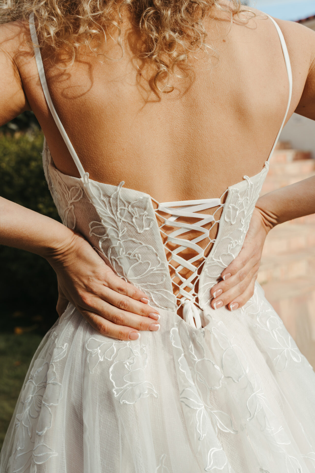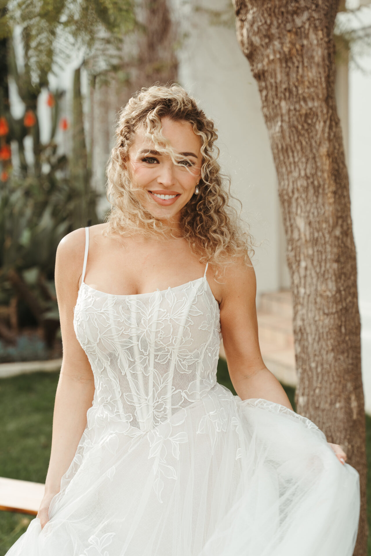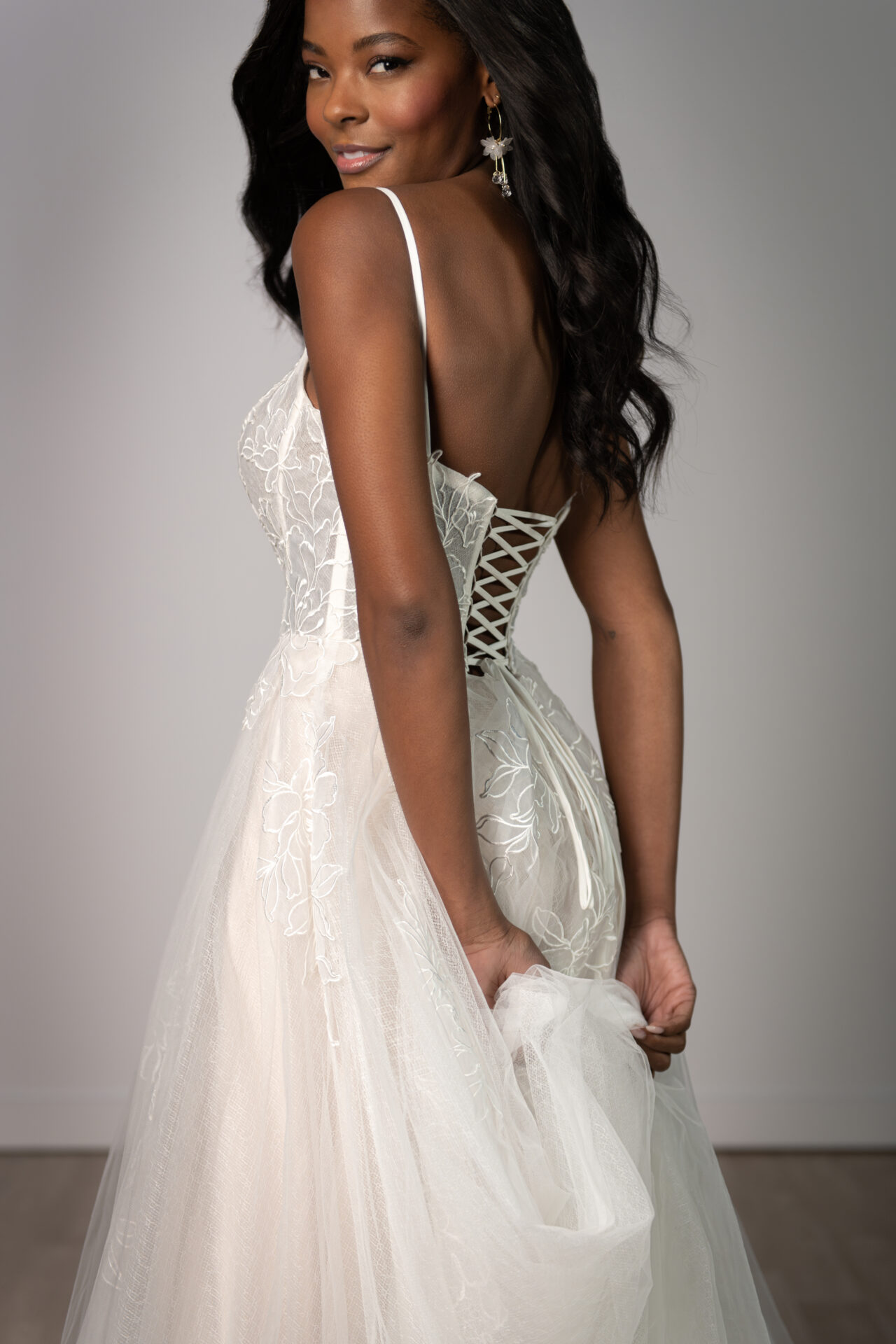 Both glamorous and romantic, Style SY8114 is a dreamy matte lace ballgown designed for the modern princess bride. Delicate spaghetti straps frame a sheer bodice with exposed boning, beautifully adorned with oversized organza lace appliqués. From the classic basque waist, scattered floral lace drifts down the airy tulle skirt, enhancing the enchanting ballgown silhouette. Blending timeless elegance with modern charm, this breathtaking wedding dress is the ideal statement for the bride who desires a fairytale-worth look with a contemporary edge.